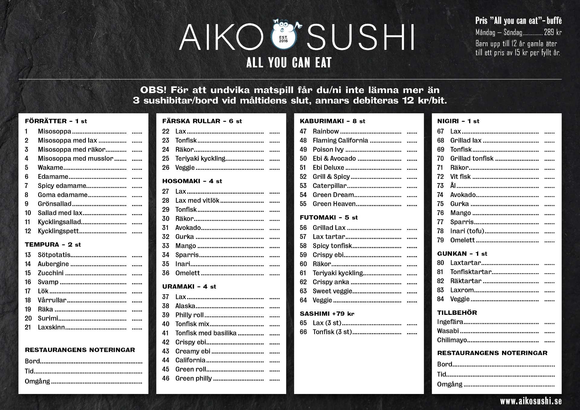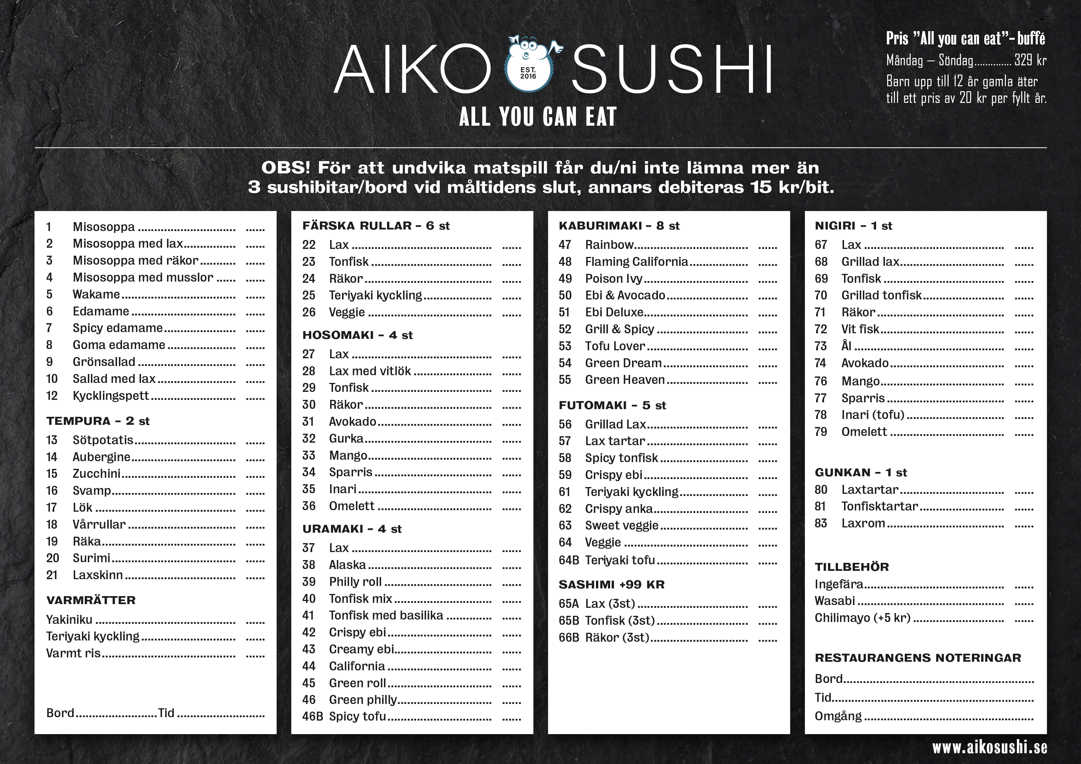 OBS!!! För att undvika matspill får du inte lämna mer än 3 bitar sushi vid måltidens slut, annars debiteras 15kr/bit.
